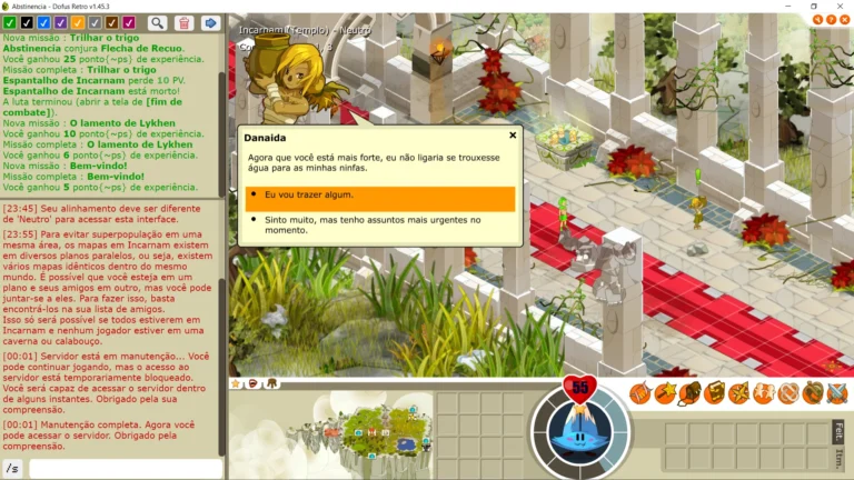 Posição: [-1,3] Pré-requisitos: Nenhum Recompensas: 75 XP , 25 Kamas Águas do banho Essa é uma das primeiras missões de Incarnam, onde você irá encontrar o npc ‘Danaida‘, ao